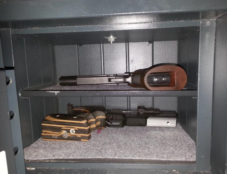 Sobre de esas pistolas que se ven (que desansan "desnudas" sobre la moqueta-fieltro), guardo otras ENFUNDADAS (en una funda de transporte de estas de TOPGUN, como las de la foto). Es decir, las de abajo (las mas grandotas) duermen "a pelo" sobre el fieltro y las de arriba "enfundadas"). En ningún caso mis armas tocan "hierro con hierro".