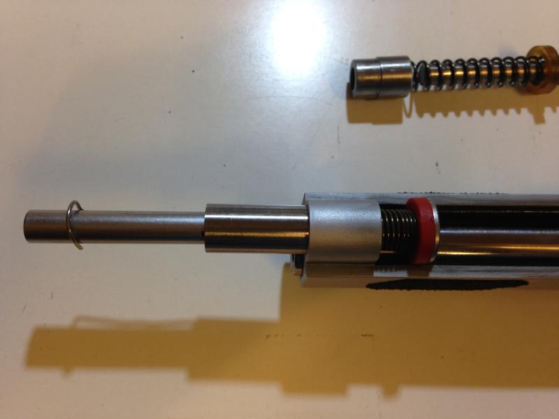 Hice la foto así para que se viera claro hasta dónde puede retoceder la varilla, De hecho es en ese punto "de asiento" en el que la varilla empuja a la corredera hacia a atrás.