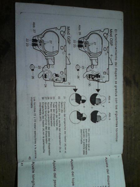 Si los tienes muy apretados el 23 no deja soltarse el fiador y el 22 no deja armarse de nuevo el disparador y el 30 es el ajuste del fiador. El peso lo regulas con el 26.