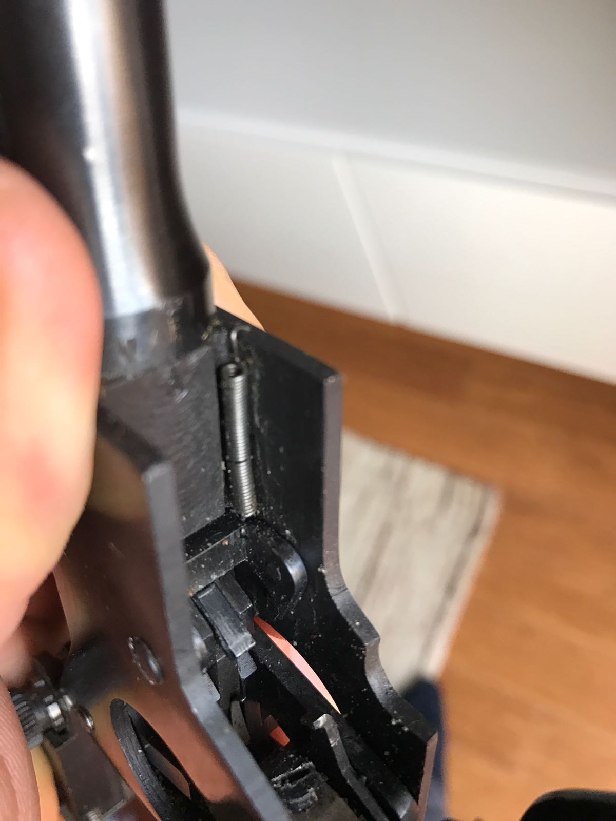 Como dice el compañero, ahí va enganchado un muelle muy fino, que devuelve la pieza a su posición original. Yo sólo la he desmontado una vez y por poco lo pierdo. Creo que lo mejor es que te hagas uno tú mismo, con un poco de maña. Es muy difícil encontrar piezas de estas armas. El muelle termina en forma de gancho en ambas partes, de manera que engancha la pieza al armazón. Puedes informarte sobre el tema en pilkguns, o consultar a un armero.