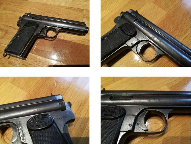Como me gustan las armas curiosas y más si tienen más de 100 años (mi unidad fue fabricada en 1915) hice lo posible por encontrar una unidad en buen estado, cosa que pude conseguir precisamente en este foro a un precio muy razonable, sobre todo teniendo en cuenta que se trataba de un ejemplar en calibre 380 o 9 Frommer (bastante más escasas que las 32ACP o 7,65 Frommer). La pistola me llegó en bastante buen estado, especialmente mecánico. El aspecto exterior se correspondía evidentemente con su edad y uso, incluso se podría decir que era mejor de lo esperado. Las cachas no presentaban demasiado desgaste ni desperfectos así que me pareció un buen proyecto de restauración. El principal problema estético era que alguien había borrado a base de esmeril una sección del armazón cerca del disparador (probablemente para eliminar un marcaje no deseado). En las fotos se puede ver el daño causado.