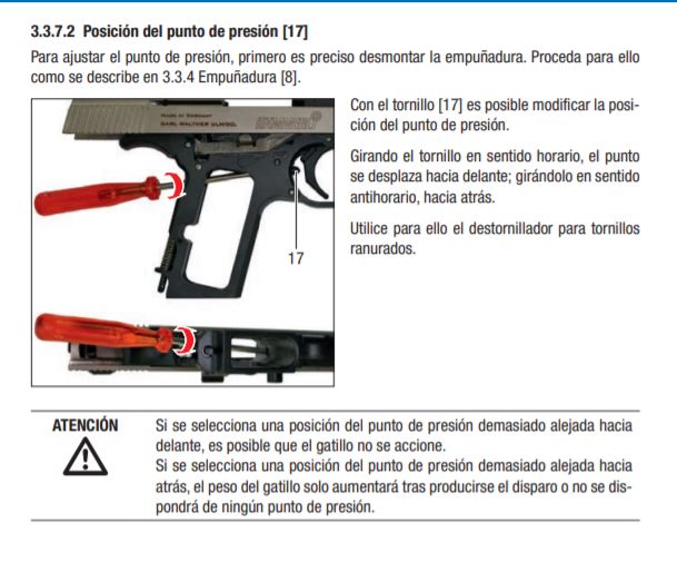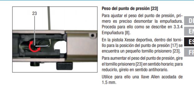 Aquí las dos regulaciones de las fases y sobre todo, me parece importante, de la regulación de la presión del segundo recorrido del gatillo en la Sport.