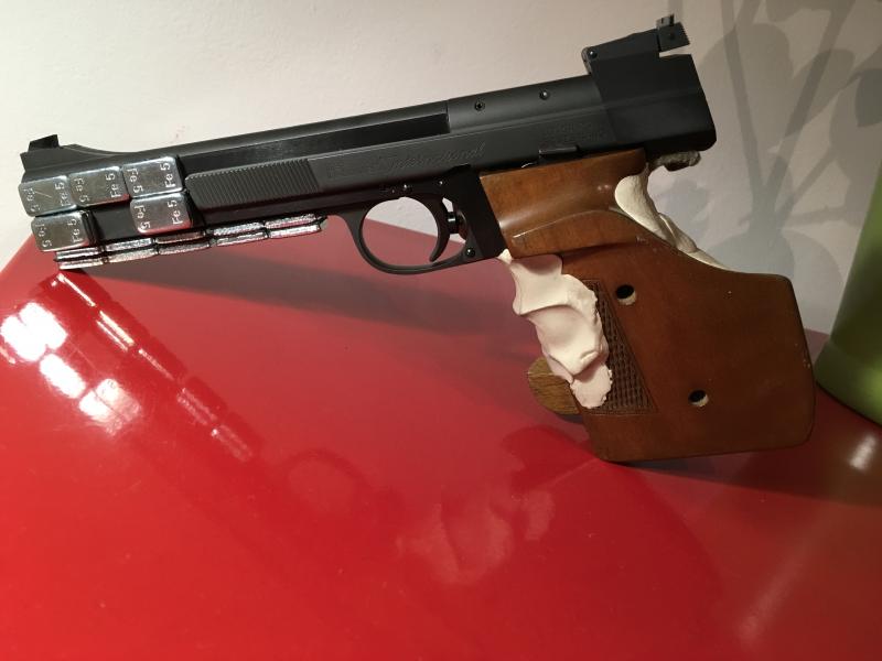 Por fin me llego el contrapeso pesado que gane en E gun, joder 3 semanas ha estado el condenado entre Frankfurt, Madrid y Barcelona, pero claro era la peor época para correos por la navidad, bueno pues ya lo he probado, en precision cuesta un poquito más la parada , aunque hago los mismos puntos, pero en tiro 10" y 20" si se nota que no se mueve apenas la pistola después de cada disparo,como ya me habíais aconsejado es importante este contrapeso pesado para la fase de tiro rápido, bueno ahí pongo las fotos de la Hammerli con su contrapeso y las dianas que ha hecho, un saludo.