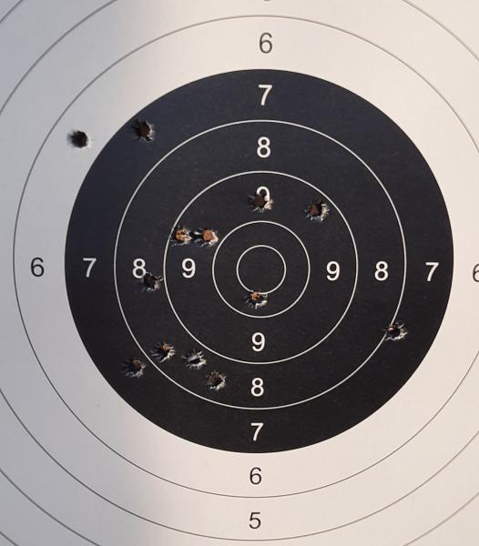 Os adjunto tambien foto de mi primera diana con ella a 25 metros y a una mano. Lo cierto es que me ha sorprendido su comportamiento a esa distancia. Es bastante saltarina, logico por su peso y corto tamaño. La municion empleada fue fiocchi gas check, que es la que venden en mi club.