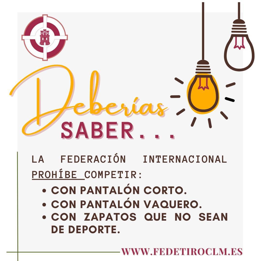 En Murcia, tanto en los clubs como en la federación la gente va como le sale de las narices, y los árbitros hacen la vista gorda, imagino que en las tiradas nacionales, he hecho pocas y no me acuerdo, harán más hincapié, pero desde interclubs hasta autonómicas nada de nada, sólo recuerdo una vez un ayudante de árbitro me dijo que el pantalón de deporte era demasiado corto, le dije que había menos de 7 cm hasta la rodilla estando de pie, que sentado era normal que se subiera, que cogiera un metro.