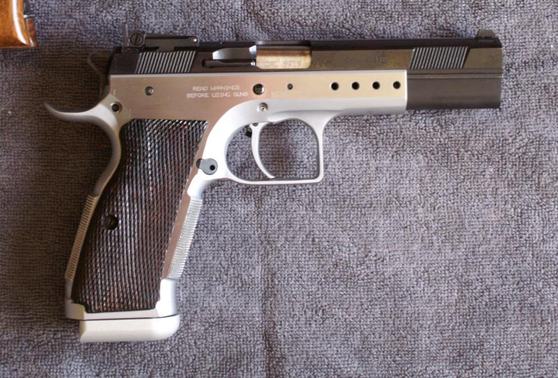 Un disparador en simple acción nítido, sin arrastres, corto, de poco recorrido, con regulación de carrera (trigger stop) suave, de poco mas de un Kg, unido a unas miras regulables para poder cambiar el punto de impacto, con la mejor empuñadura que pueda tener una 9 mm, herencia de la CZ75, evidentemente es mucho mas fácil hacer puntos....... :D