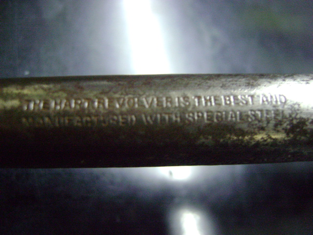 Hola TERRAN, para distinguir los revólveres eibarreses de principios del siglo pasado, te tienes que fijar en el logo del fabricante tanto en el armazón como en las cachas, la leyenda del cañón es un "spainglish" para despistar al comprador haciendolos pasar por fabricados en USA "el revólver Mart o Hart es el mejor y fabricado con acero especial" reza el tuyo.