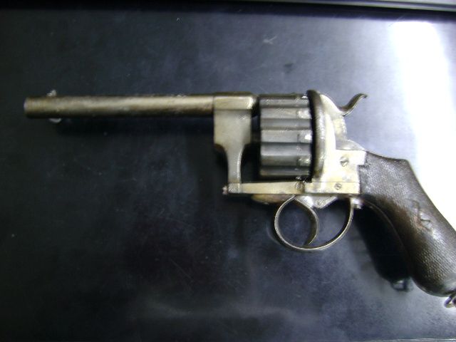 Parece un revolver de 9 mm Lefaucheaux, en este caso sistema J. Chaineux que haya sido convertido a fuego central. Fíjate que los huecos en el tambor por donde debían asomar las espigas de los cartuchos han sido cegados. Puedes poner una foto del martillo para ver qué tipo de percusión utiliza?