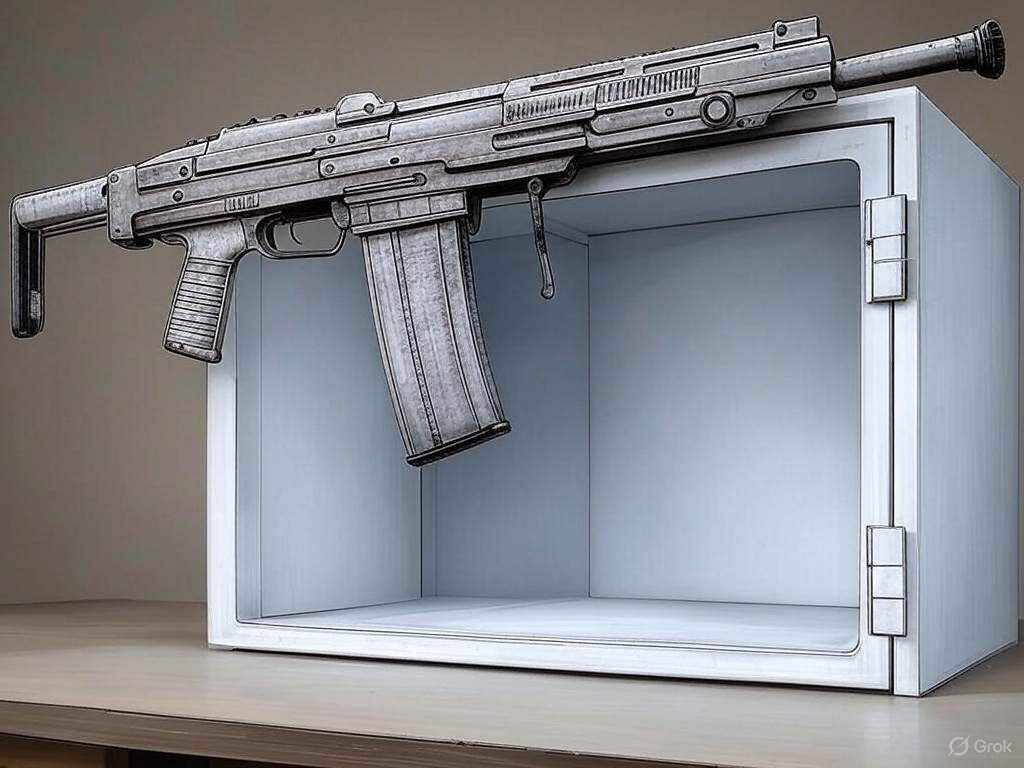 En la imagen puede verse las medidas interiores de una caja fuerte homologada en grado III. ninguna de las aristas interiores mide 60 cm, y por tanto, una pistola de 60 cm no cabe dentro.