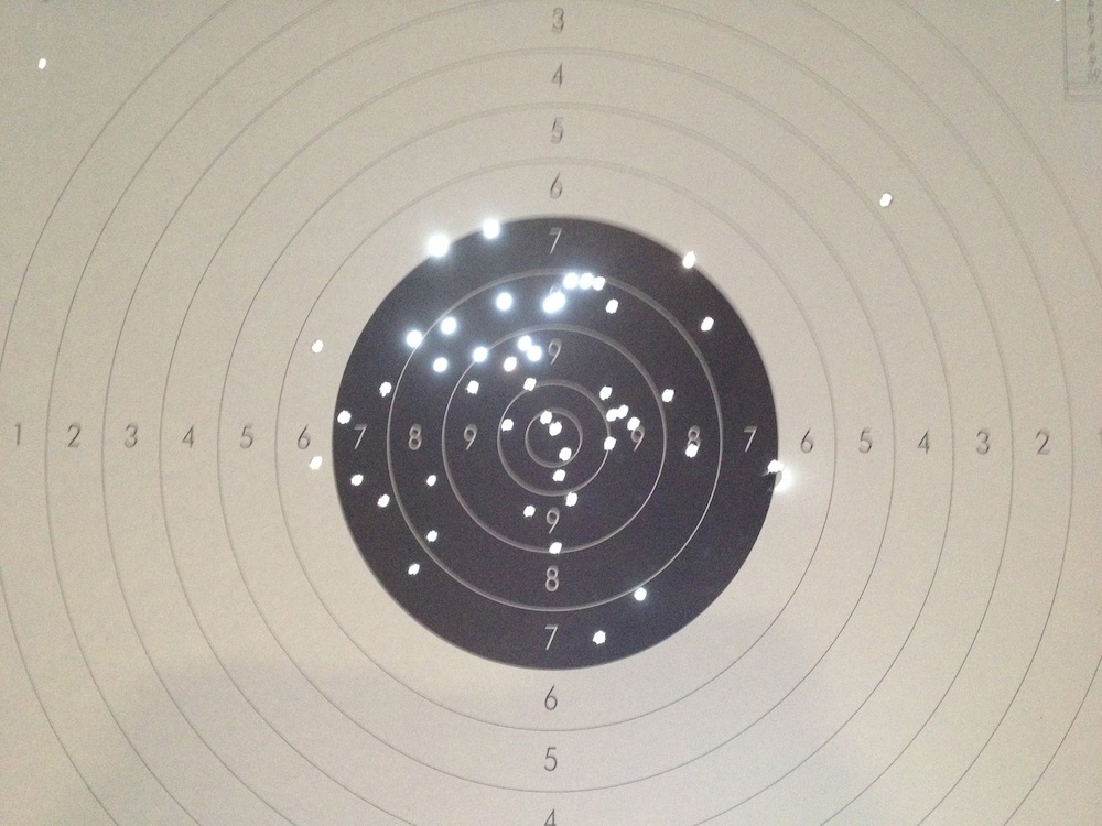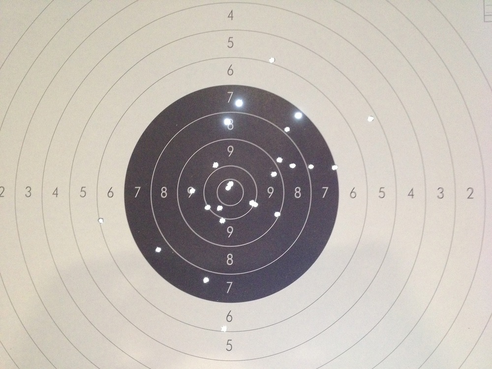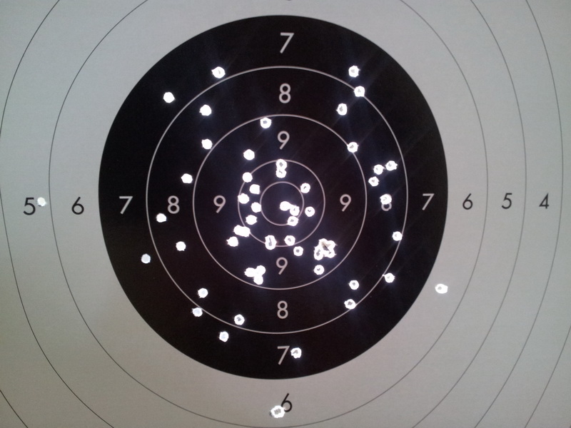 El cero no es mío (es uno de los pinchos de sujeción del blanco) pero lamentablemente los otros si que lo son. Los achaco a que, de verdad, se me cansa el brazo un montón. No esperaba esto, y la verdad es que la MG2E RF pesa mucho cuando ya llevo 30 o 40 tiros (y eso que me lo tomo con calma y descanso entre disparo y disparo...). No se qué haré el 27 con pistola de velocidad que no puedo descansar... Imagino que el ridículo, pero no me importa.
