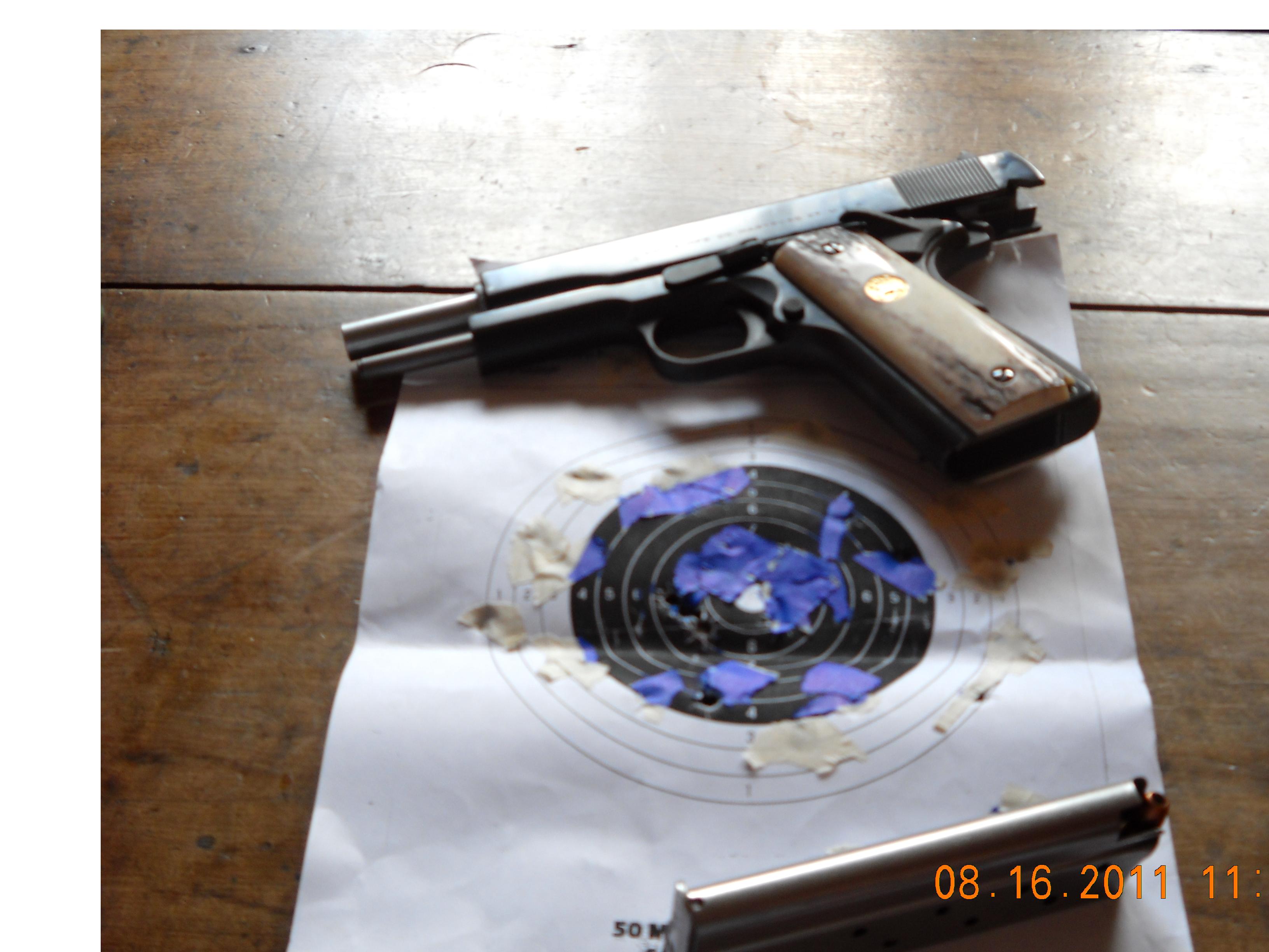 Me disculpo por sacarlos un poco del hilo de los metodos de fabricacion para compartir con ustedes una agrupacion realizada con mi colt. Es una 38 super fabricada en 1948, esta repavonada y posee algunos accesorios, en particular las empuñaduras, guia,aligerar disparador y un cañon del 9 para. Esta tiro lo realice ayer, a una distancia de 30 metros con municion del 9 remington punta hueca de 115 grains (llegar a hacerla me costo casi 4 meses de ensayo y error ademas de 1000 balas). Jusguenla ustedes, saludos.