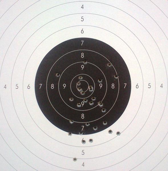 Me he visto incapaz de mantener la pistola quieta. Aparte de la falta total de entrenamiento he adelgazado unos kilos y he perdido masa muscular en los brazos, que creo que me ha afectado. Se me iban muchos impactos bajo.