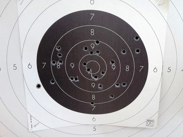 El blanco es de 25 tiros de varias municiones como he dicho más arriba, las miras son las originales tal como me fué entregada, disparando a pie de negro a 25m tal como las series de precisión de 9mm o Fuego central. Teniendo en cuenta el gatillo y mi poco desempeño con el mismo juzgad vosotros mismos.
