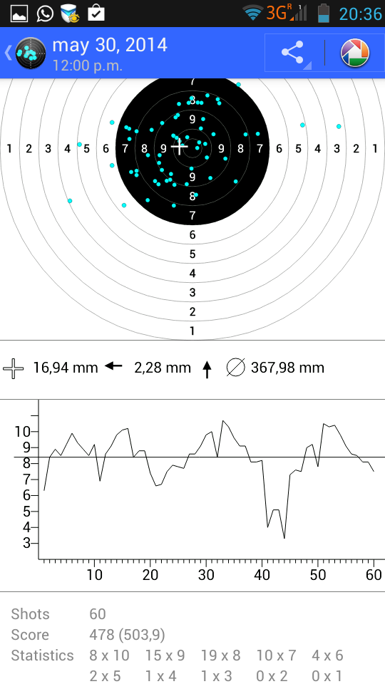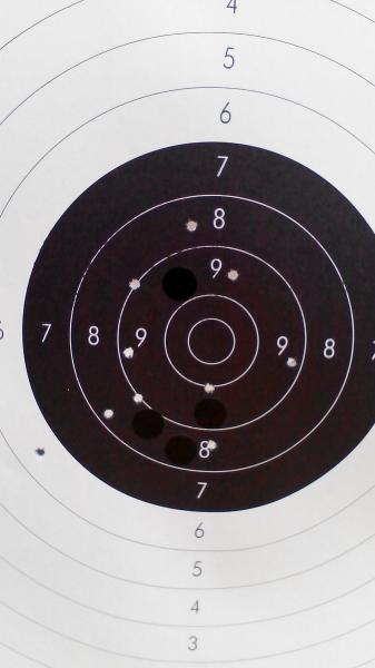 Mirando los blancos, veo que son algunos disparos aislados que se van fuera (muy afuera) 3, 4 5.... etc. y no muchos 7 y 8...... Hay que corregir esas desconcentraciones o esos "furcios" esporádicos.