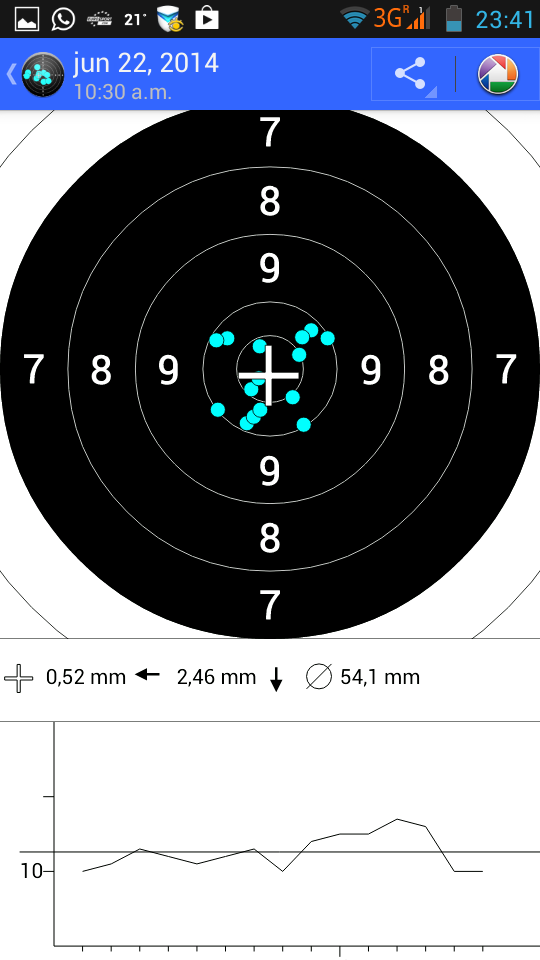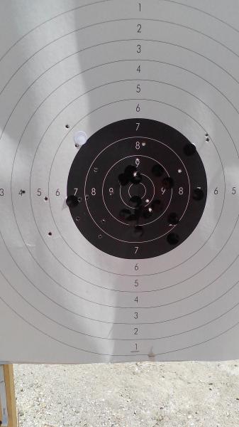 El caso es que sigo ascendiendo!!!! He tirado 75 balas con una media de 8,42. Lo que en 60 disparos seria superar los 500 puntos!!!! Esa barrera psicológica!!!!! 15 de ellos han ido al centro, y tan solo se me han ido 4 disparos fuera del negro: uno al 5 y tres al 6, creo recordar (en cuatro series rápidas que hemos tirado). Lo bueno es que empiezo a ver donde fallo en estas series. Como ya comente que me pasaba en el tiro en seco, algun disparo se me va alto. En el momento de apretar el gatillo sube el guion. Eso porque es debido???