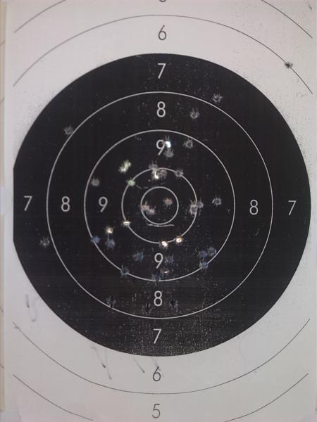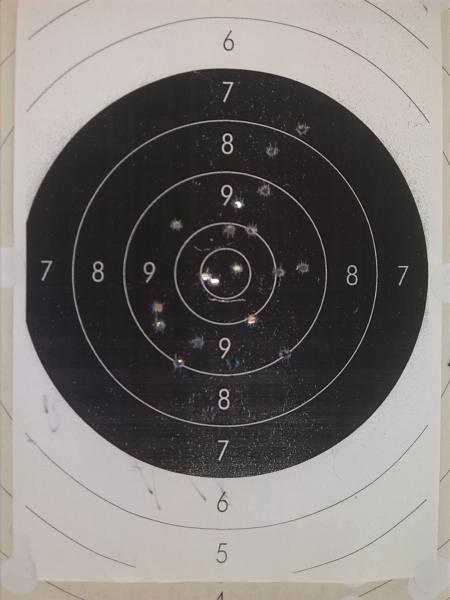 Noto una cosa que nunca me había pasado. Tras hacer unas buenas series de 150" y 20"(sorprendentes porque era la primera vez que tenia a mi mujer viendome entrenar), las primeras series de 10 han sido bastante malas. Casi todos los impactos entre las 6 y las 9..... De lo que parecen claros gatillazos. Con centro de la agrupación a las 7:30 en el 7.