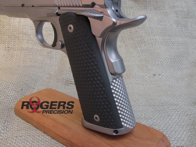 Para aquellos que tengan 1911 sin picado frontal en la empuñadura, comento que yo he comprado a un compañero del foro una de estas piezas de Wilson Combatt, son una simple lámina que se sujeta sólo con las propias cachas. El agarre mejora muchísimo, la estética no desentona y son económicas.