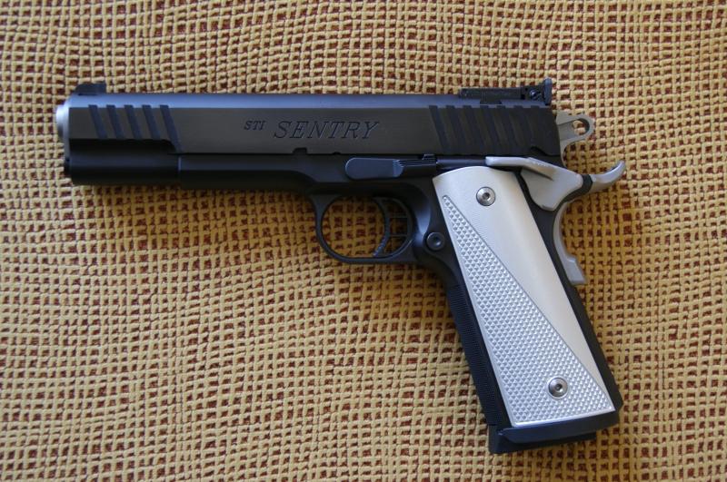 Bueno, pues esta es la mía: una STI modelo Sentry del 45 ACP. Creo que no debe haber muchas de estas por aquí. Tenía ganas de una 1911 de línea clásica pero con algún detalle moderno y ésta me pareció interesante. Después de once meses de espera, la tengo ya en mis manos aunque aún si un solo disparo. Este modelo concreto lleva armazón de acero forjado. Más detalles en la página del fabricante: