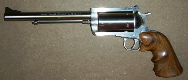 El "problema" es que la munición comercial que venden de este calibre, es toda de arma larga y, consecuentemente, quema demasiado lentamente para un revólver de 7,5". He medido la velociad de una Remington comercial de 300 grains de punta y dió una Vº inicial de 240 m/s, porque sale el proyectil cuando aún queda pólvora por quemar. Resultado: Una gran llamarada y un proyectil flojo. Pero recargando (los componentes se encuentran sin ningún problema) todo va sobre ruedas.