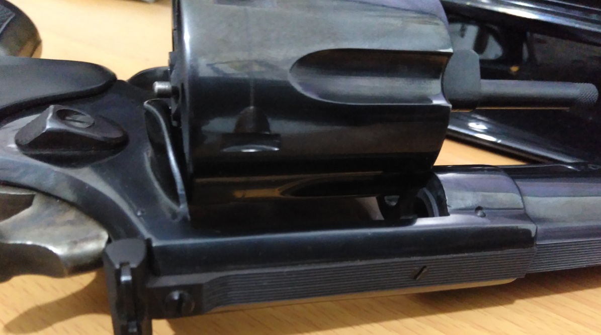 El funcionamiento básico del revolver creo que lo conocemos todos, no es un reactor de fisión nuclear y no presenta grandes misterios. Y así es, el cilindro del mio y claramente no sólo el mio (en las fotos del compañero se ve el mismo resultado y otros dos hablan de lo mismo), golpea en el borde del cañón, pero se trata de un valor de desajuste extremadamente pequeño, nada que ver con las distancias entre el cartucho y el escudo. Los signos de ese desgaste no son de ninguna herramienta, es fácil ver como da exactamente ahí, acercando el cilindro con la mano, y lo que son como rebordes dentados que se ven (bueno, verse se ven en foto, a ojo todo el desgaste es una pequeña y fina línea) corresponden a las esquinas de lo que son las acanaladuras del cilindro.