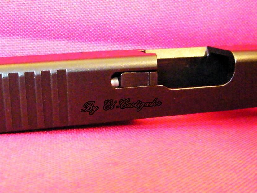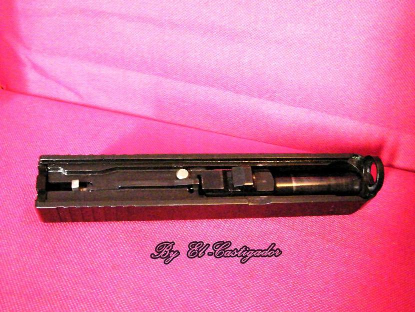 Y ya lo tenemos montado, algo muy a tener en cuenta es que el muelle este bien montado y en su sito ya que sino este sobre sale del cañón y al introducir la corredera sobre el armazón este toca en el armazón y no podremos montarlo, incluso rozaremos el armazón con el muelle como se podrá ver en las fotos que vienen a continuación.