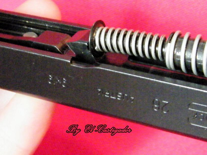 Despues procederemos a poner el muelle recuperador de la corredera de igual forma, introduciendo primero el extremo de plástico en el alojamiento que tiene la corredera en la parte de la boca del cañón, para luego con una pequeña presión en la parte contraria del muelle de la corredera ubicar la pieza de metal que porta el muelle en el alojaminento que tiene el cañón para la misma.