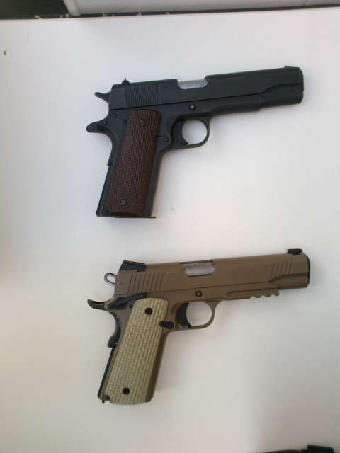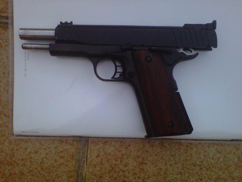 Mi recien adquirida Norinco junto a una bonita joya. Por cierto que a cada minuto que pasa estoy más contento con la compra de la 1911 china, si bien es cierto que sus terminaciones interiores son bastante toscas (se nota el fresado, etc) es algo que no me importa y no hace en mi opinión más que acentuar la pinta de arma tosca y todo terreno que es.
