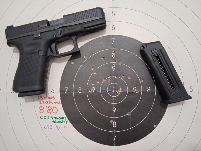 Compré esta pistola para divertirme, pero me dejó sorprendido cuando la probé en el campo de tiro. Os adjunto 2 dianas a 25 metros, de pie, una mano y sin apoyos. A pesar de su disparador (de defensa, no de tiro) y su cortísimo cañón (clava en medidas al modelo 19) la precisión intrínseca del arma es para quitarse el sombrero.