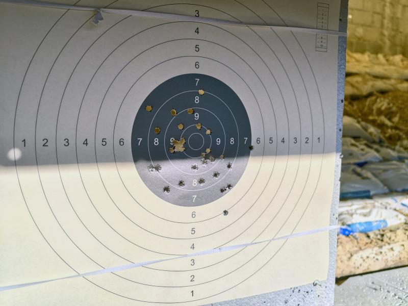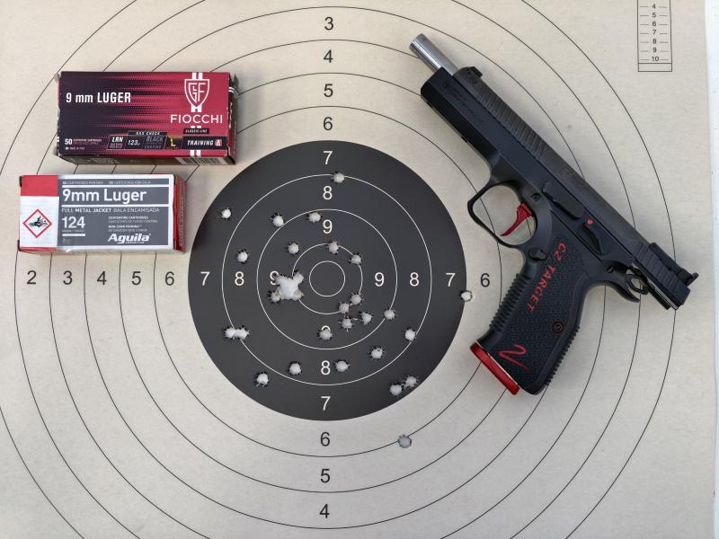 He tirado unos 40, quizá 45 cartuchos en total. Primero centré las miras; luego puse una diana nueva y el resultado es el que veis. He utilizado munición comercial, Fiocchi de 124 gr, y los últimos diez han sido Aguila 124 gr FMJ, y mi sensación es que la pistola tiene muy buena precisión. Soy yo el que necesita entrenar más y empezar a recargar.
