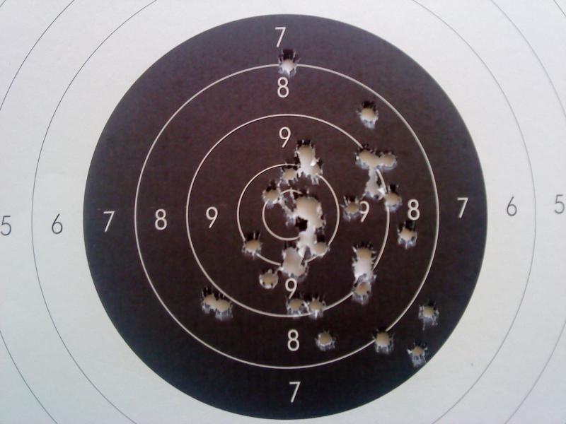 Después de esto, ajuste miras y estuve disparando alternadamente con una y otra pistola series de cinco cartuchos. El resultado fue bueno en ambos casos... Después de 25 disparos con cada una, aproximadamente un numero semejante de dieces y nueves para ambas y en los dos casos un "único" disparo malo (ocho) por pistola!!!!