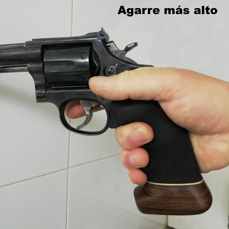 Aparte que empuñar más alto o más bajo hace que la bala pique más alto o más bajo, sobre todo en un revólver.