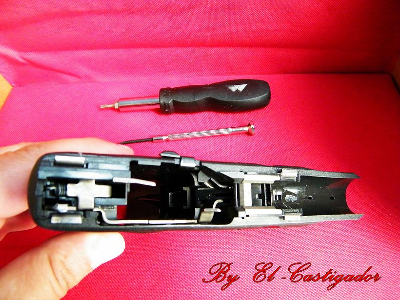 Esta vez utilizaremos un destornillador plano más largo ya que nos será útil para extraer mejor el extractor del cargador ( yo le monte el sobredimensionado y estoy muy contento, es más comodo y no molesta nada durante el disparo )