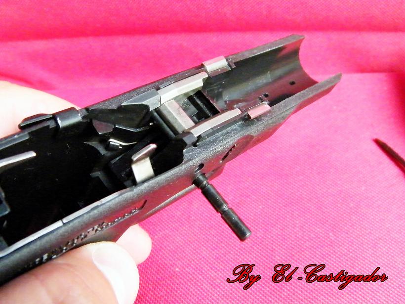 En esta primera foto antes de nada veremos los tres pasadores que lleva el armazón para desmontar el conjunto de disparo, como se puede ver son distintos los tres y es por algo, ya que si nos saltamos algún paso y nos liamos a golpear el pasador pensando que esta atascado nos podemos cargar alguna pieza como por ejemplo la retenida de la corredera en el mejor de los casos, los pasadores salen sin golpes solo con presión, bueno pongo la foto y explico la función de cada uno y más adelante el orden de desmontaje y por que.
