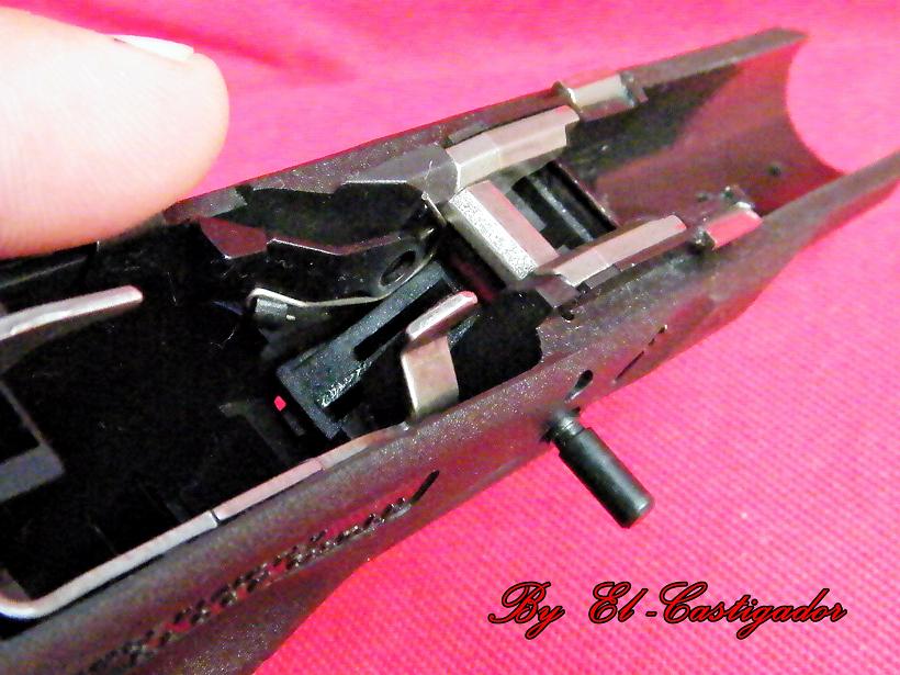 En esta foto se puede ver como una vez que se ha extraido parte del pasador la palanca de retenida queda suelta de su alojamiento como se puede ver va a la izquierda del gatillo en el lateral no en el medio ya que al montar puedes intentar ponerla en la ranura que tiene este
