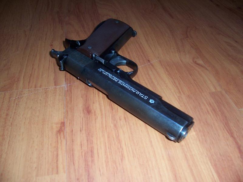 Se trata de una STAR A de 1934 (pacopi tiene una igual con el escudo de la Guardia Civil), que me regaló un compañero de oficio y que a el se la regaló alguien con titulo nobiliario de Badajoz, que no recuerdo, que la compró cuando empezó la Guerra Civil del 36.