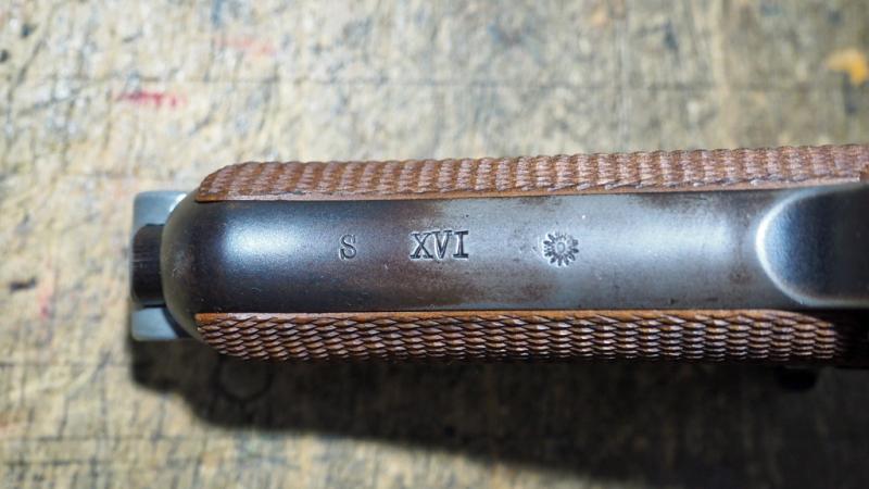 No hace mucho pude hacerme con esta P08 y hay en ella una inscripción que no logro saber lo que significa. En concreto se trata del marcaje que hay en la parte delantera de su empuñadura.