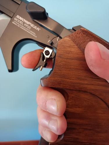 Si está a 45º al colocar la falange y presionamos el primer y el segundo tiempo, en el momento de disparar ya ha perdido este ángulo, esto es algo muy " difícil " de regular en un revolver, por este motivo se le ponen los suplementos para que quede mas adelantado al amartillar, finalmente entrenando, entrenando, entrenando y entrenando, corriges la posición del dedo para compensar este retraso de la cola del disparador.