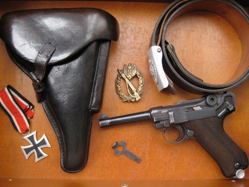Bueno, ahora ha llegado mi turno. Después de mucho buscar y buscar, y después de mucho esperar y esperar, presento en sociedad mi nueva adquisición: Mauser P08 de 1939 Código 42. Está en un estado excelente, ha sido toda una sorpresa para mí: cañón como un espejo y sin gota de corrosión, acabado original, todos los números iguales excluido el cargador.. En fin, estoy encantado. Acompaño la foto con otras adquisiciones: funda Luger original, cruz de hierro 2ª clase tipo Schinkel, distintivo de asalto de infantería en bronce (En Buntmetal, para los que entiendan de este tema) y cinturón del Heer con hebilla de aluminio.