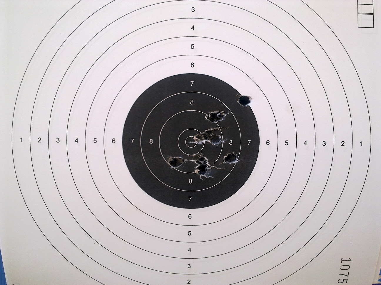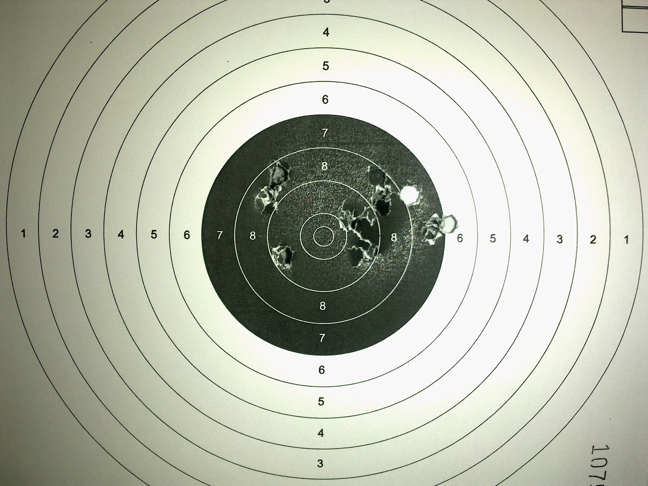 El quinto: Muy buena agrupación algo a la derecha bajo, y el error (menor, pero el tiro esta ahí) a las 2 , las mismas consideraciones, alineación del tirador, revisar el dedo.