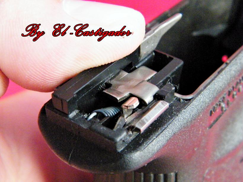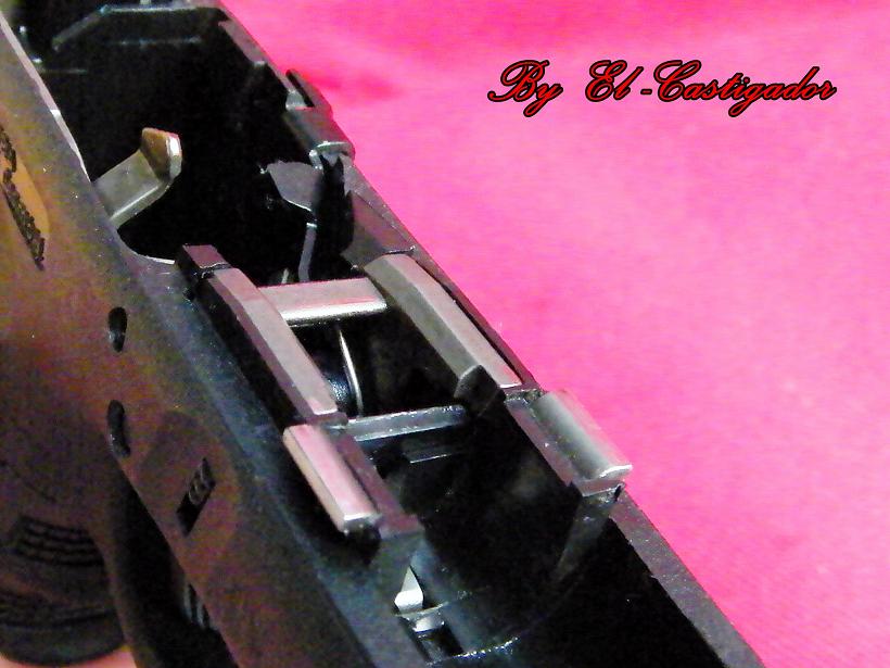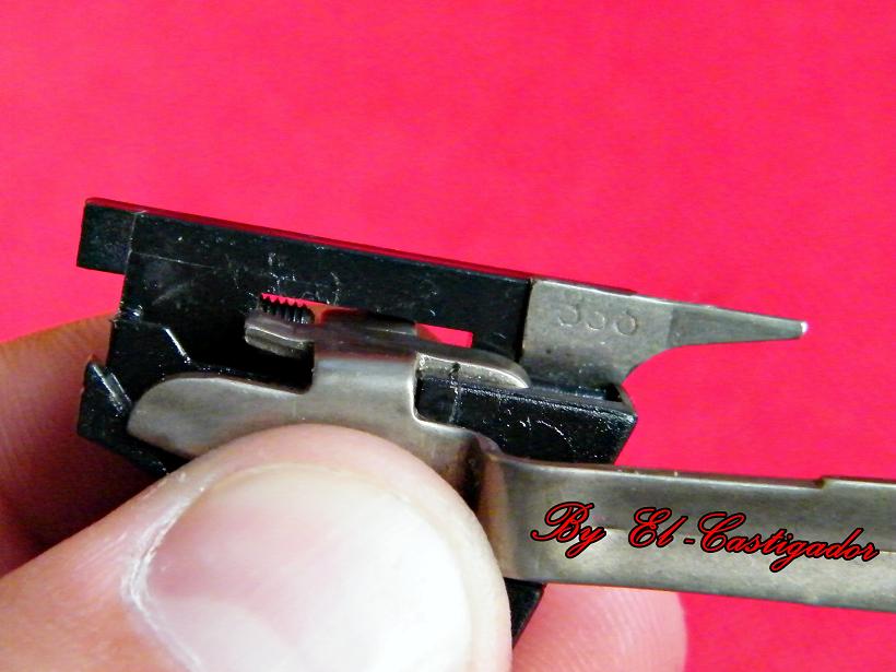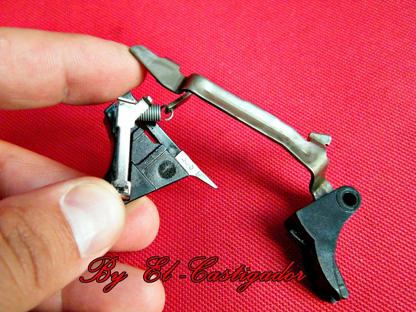 En esta foto podemos ver la famosa pieza que alivia el disparador y que lo baja de peso, se llama desconector.