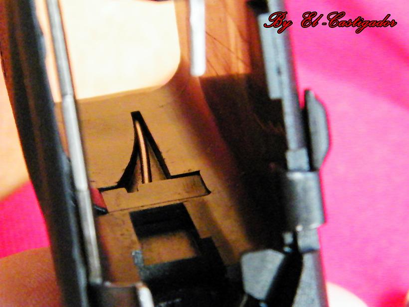 Seguramente vereis que cuando sacais el mecanismo de disparo del armazón esta pieza se abre un poco hacía fuera es normal luego al montarla apretamos con el dedo encima y entra bien en el armazón.