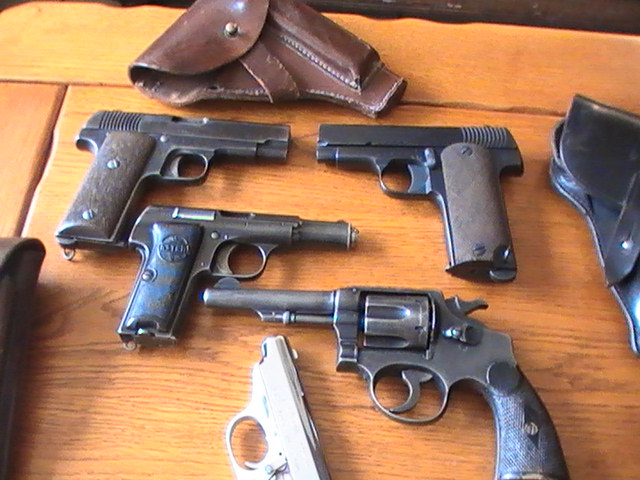 Arriba a la izquierda,1/ pistola " AK " Garnica, con marcados " GN " de Garate y Anitua.2/ Pistola " RH" Retolaza Hermanos.3/ Astra 300 380 acp . 4/Revolver copia S*W military de "OH" en 8 mm 1892 para Francia.