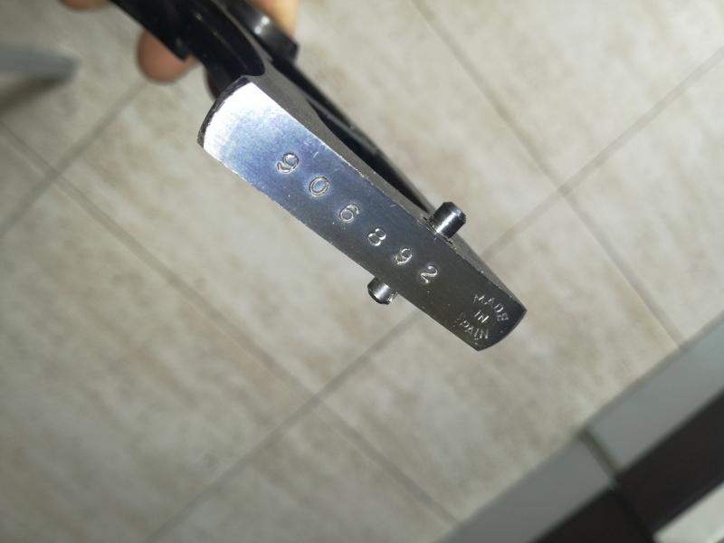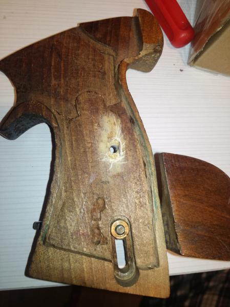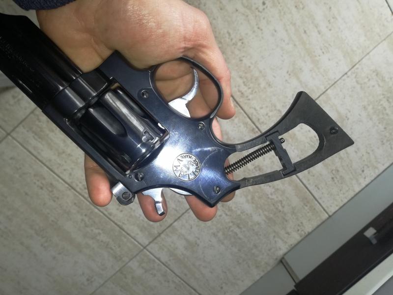 Acabo de comprar unas cachas para un revolver llama comanche de 4 pulgadas y resulta que cuando las voy a montar tengo un problema con el tornillo de regulación del talón me pega en la pieza que os mando en las fotografías, esa especie de"pasador" que hay en la parte de abajo.