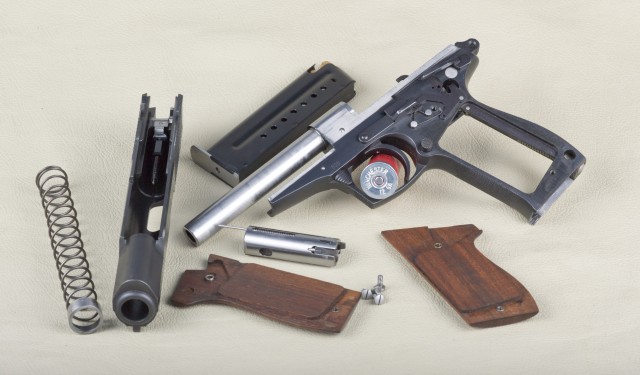 Glock le copio el sistema de desarme , tiene 2 rodillos entre cañon y corredera que permiten el mejor movimiento , calibre es espectacular 7.62X25 o 7.63 Mauser.