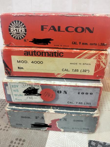 El primer modelo de caja donde venía la falcon, coincidía con el ultimo de la 3000, que dejo atrás el modelo oscuro que compartió la 300 y la 3000, para uno más vistoso, pasando a un segundo modelo con la impresión del arma en la tapa, para desarrollar el más común rojo serigrafiado con la imagen del arma repetida, con variaciones según la época en el lateral y en el escudo de la casa, para terminar en los últimos años con el estuche de plástico menos personalizado y común para varios modelos como harían otras casas, como star. Así luciría una 4000 recién abierta a finales de los 50 y principios de los 60.
