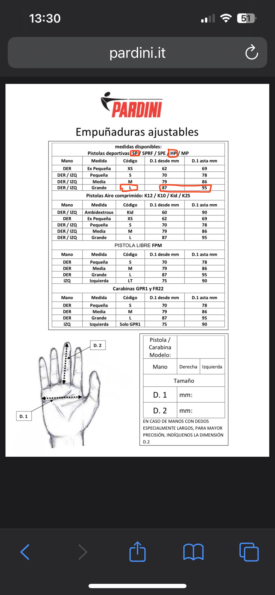 Es un drama la empuñadura, te cuento mi experiencia para una Pardini SP/HP. La pistola es de 2a mano venia con talla M, mi mano hace unos 88 mm y el dedo unos 92 mm. La talla M es corta para mi. Pille una L, de altura bien dedos bien, pero tengo mucho espacio entre la mano y la zona alta debería rellenar.