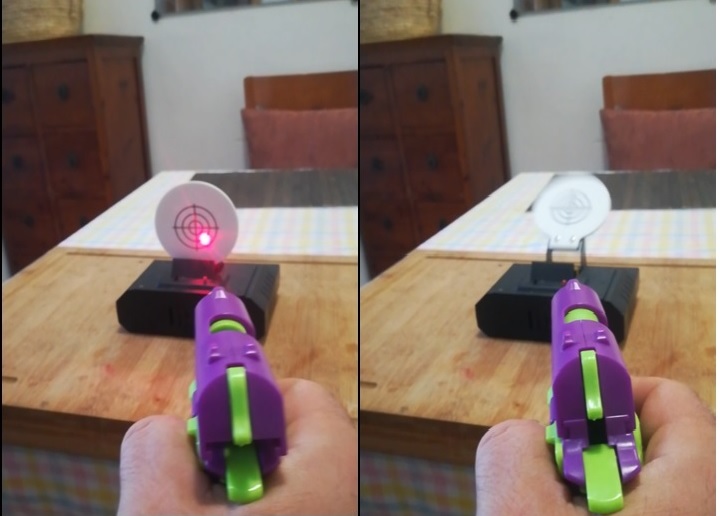 La diana se abate cada vez que recibe un pulso del láser que emite la pistola, que no es un puntero si no que a cada "disparo" se enciende y apaga el láser, y luego vuelve a subir sola.
