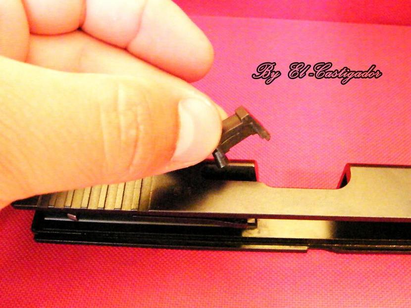 Y ya tenemos basicamente la corredera desmotada a falta de los elementos de puntería, para los cuales Glock tiene diseñada una herramienta para la extracción de los mismos.