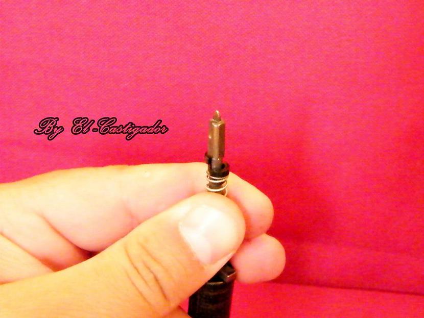 Ahora con la aguja dentro del cañón y presionando el muelle hacía abajo extraeremos las dos chavetas de semicono que sujetan el muelle a la aguja percutora.