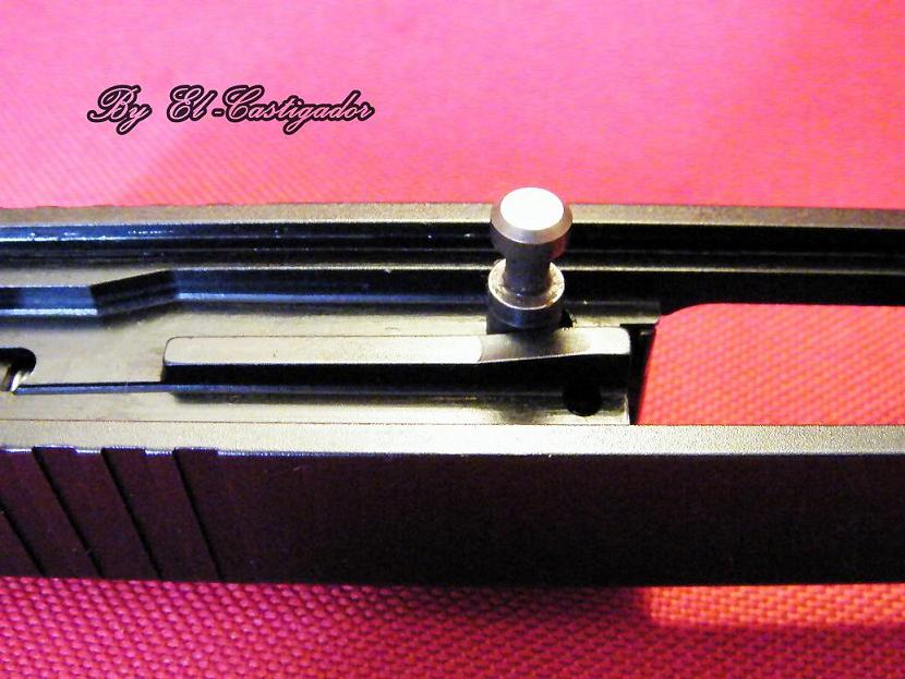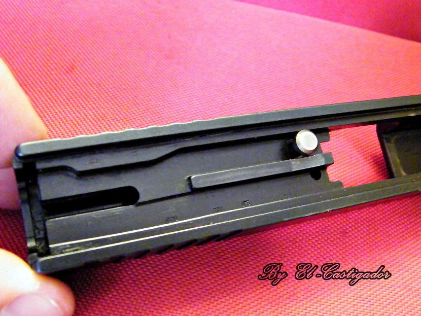 bueno con todo limpio y en su sitio procederemos al montaje de la corredera para ello lo primero que haremos es poner el tetón que sujeta la uña extratora como se puede apreciar en la foto.